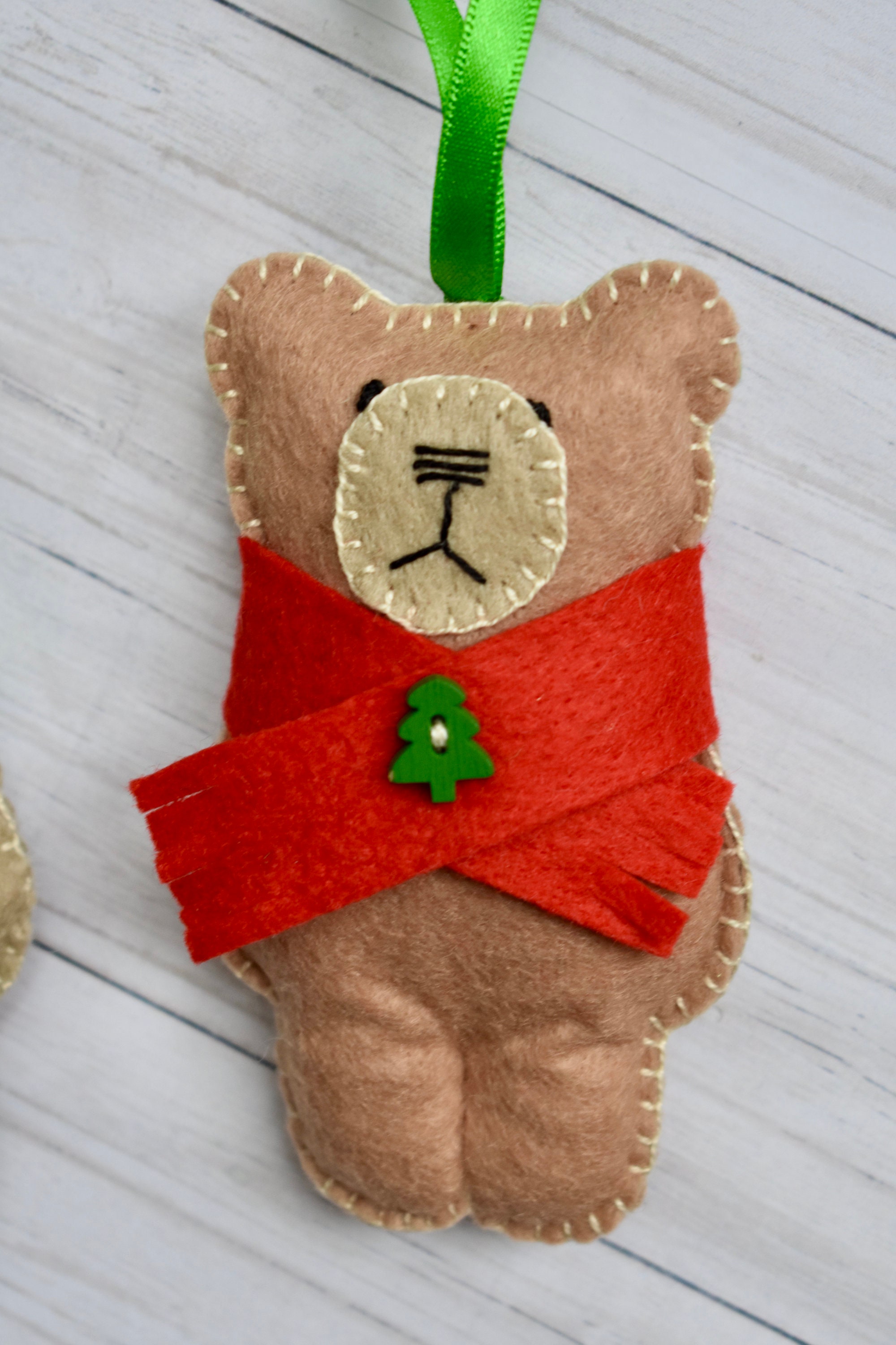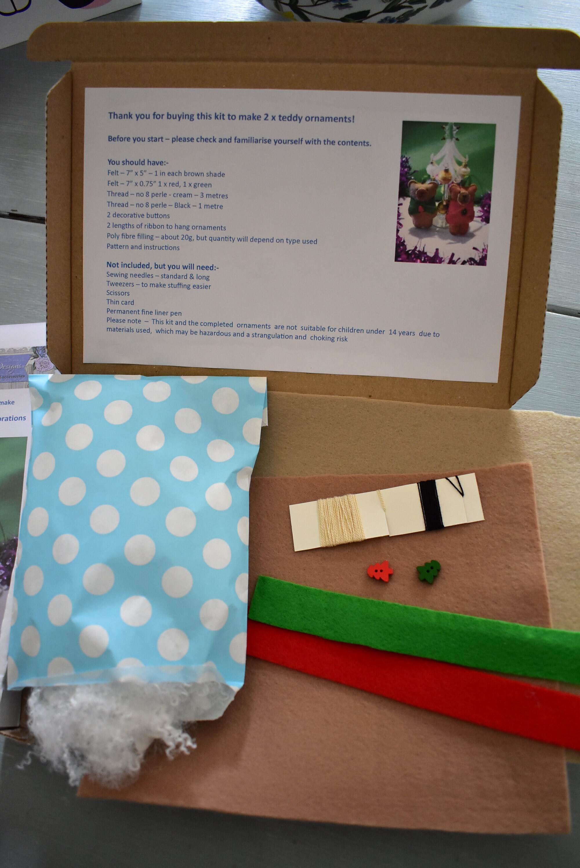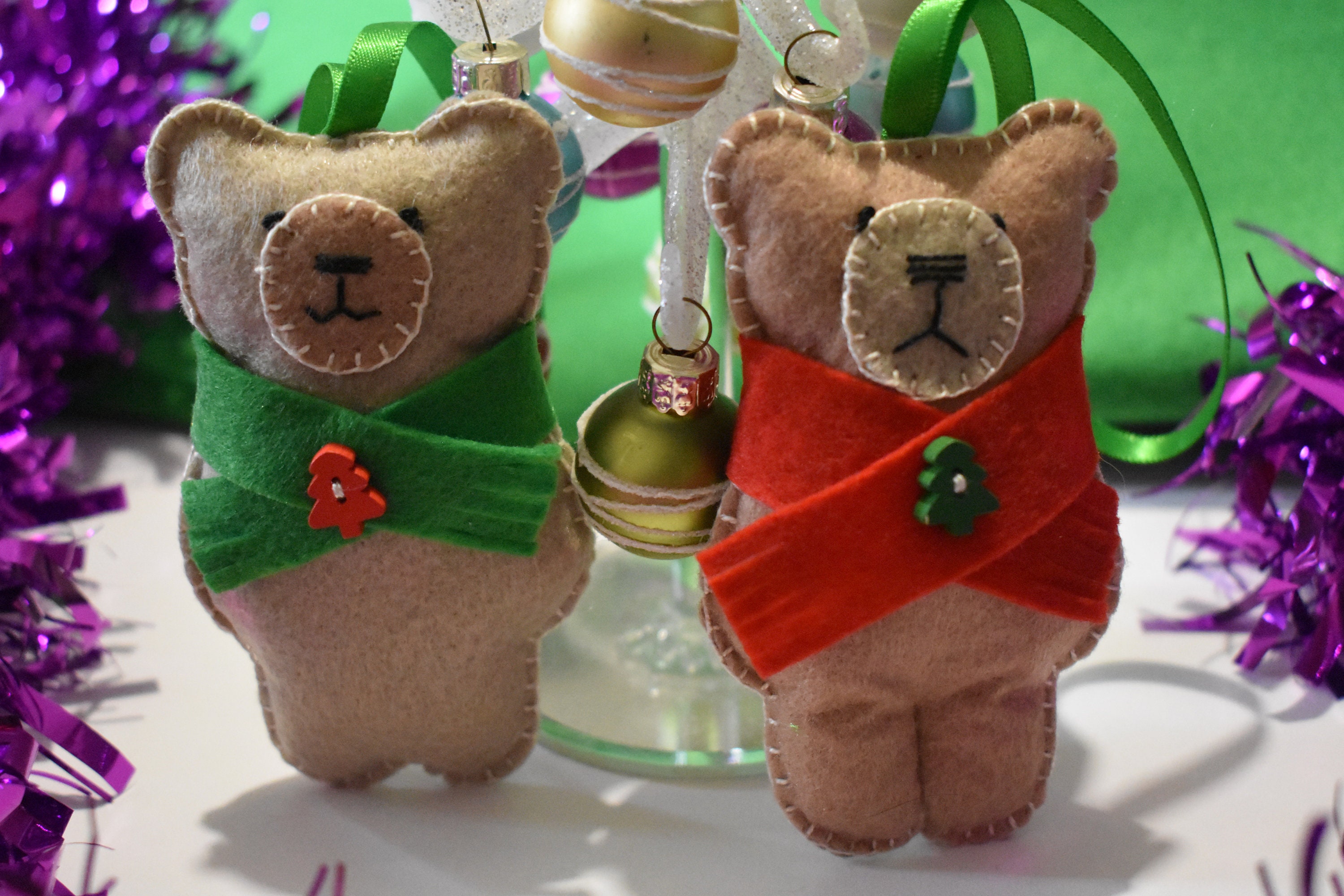 This is a complete sewing kit containing everything (except needles, pins and tools!) that you need to make a two hanging Christmas teddy decorations in felt.
