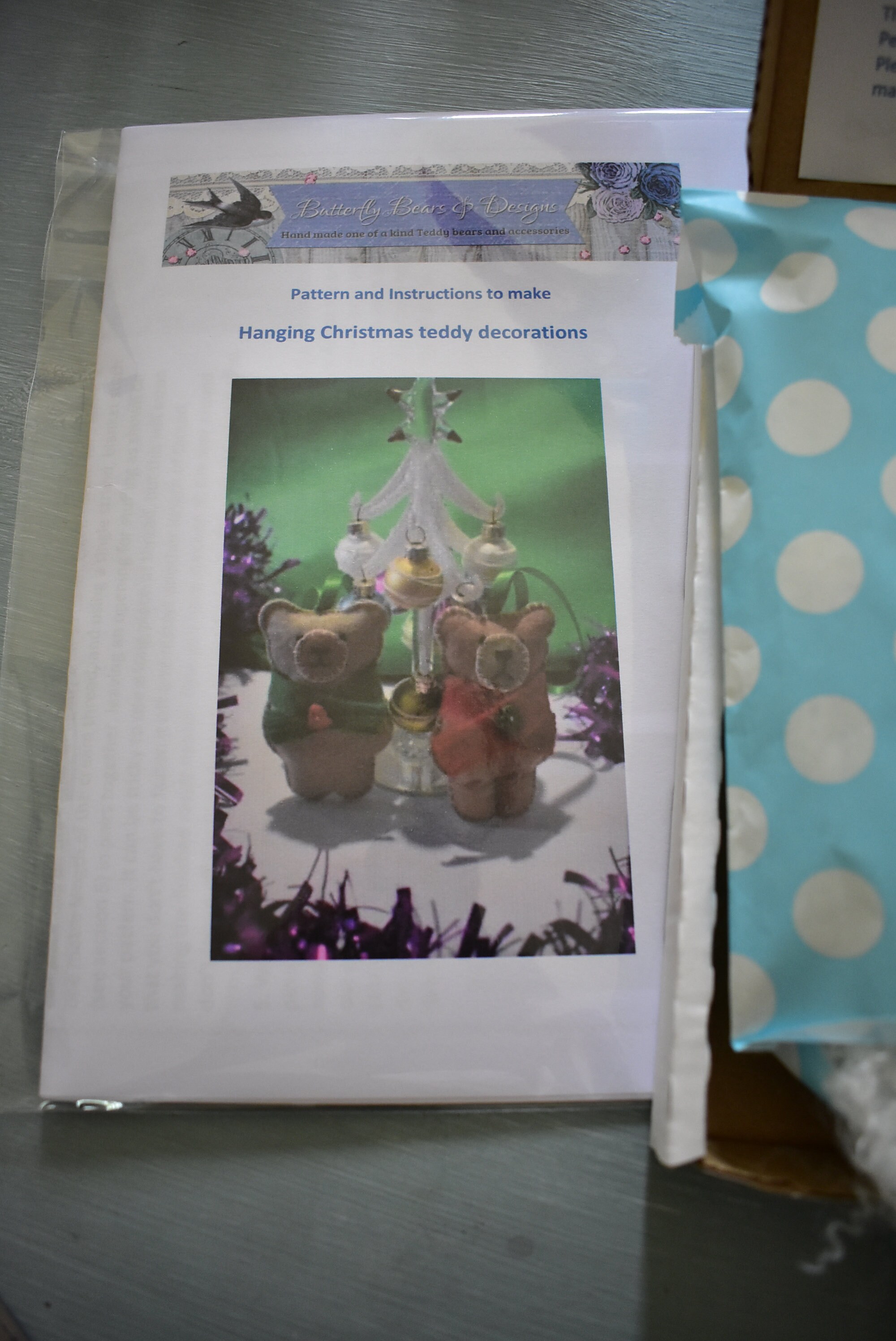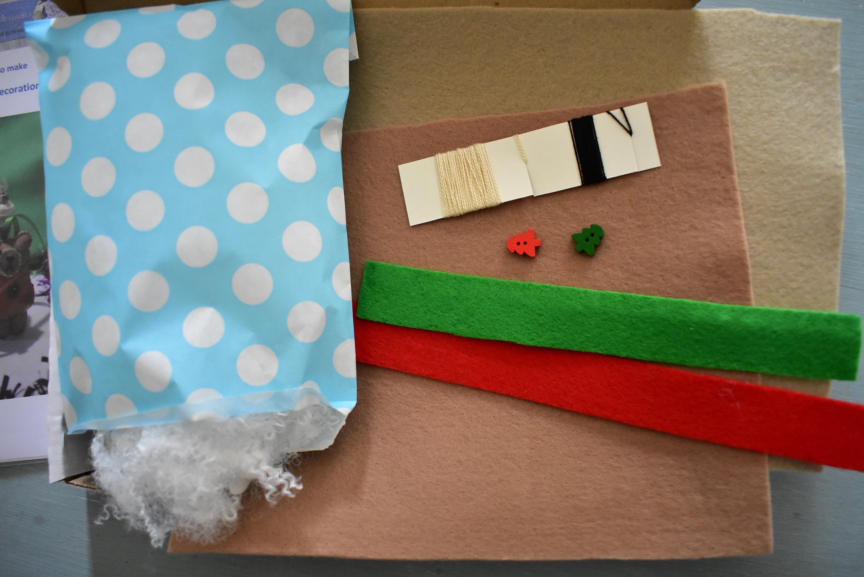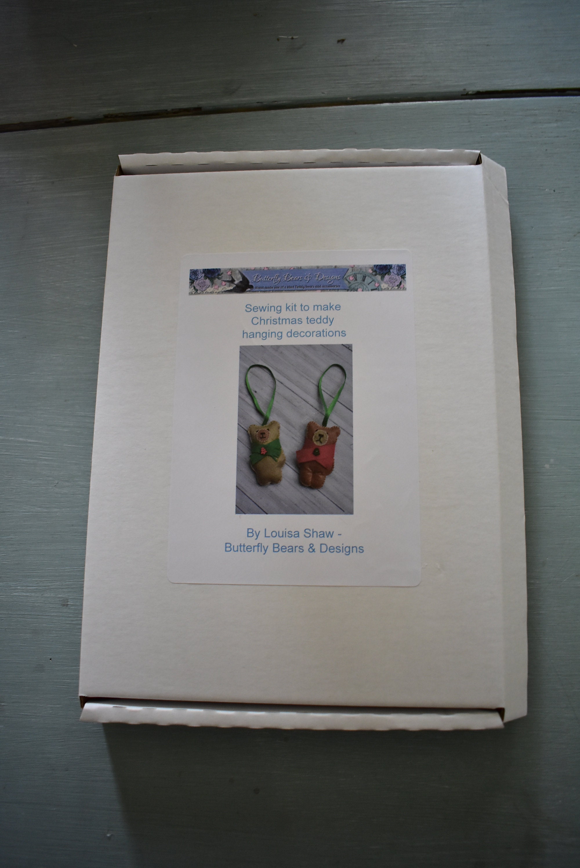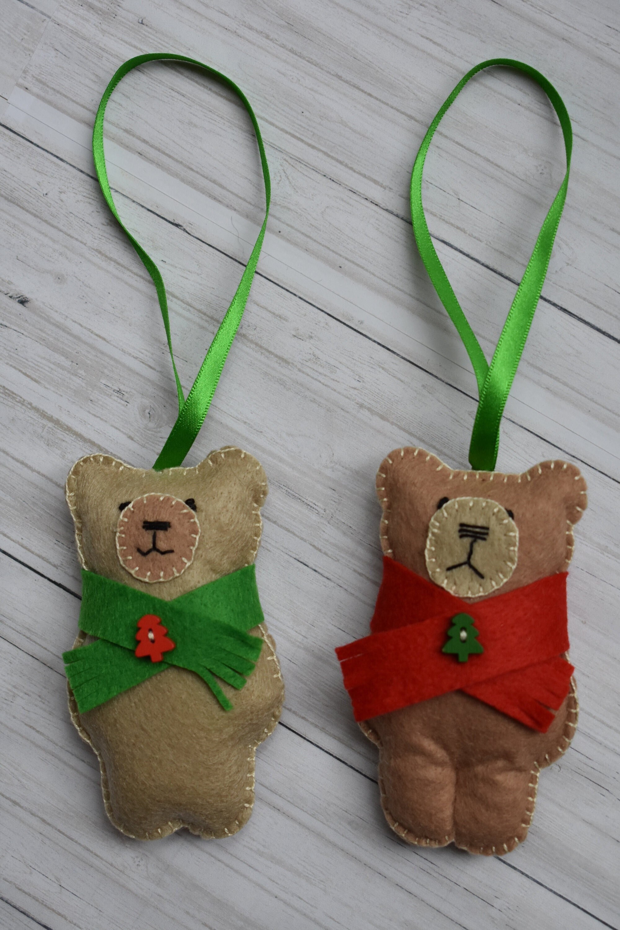 This is a complete sewing kit containing everything (except needles, pins and tools!) that you need to make a two hanging Christmas teddy decorations in felt.