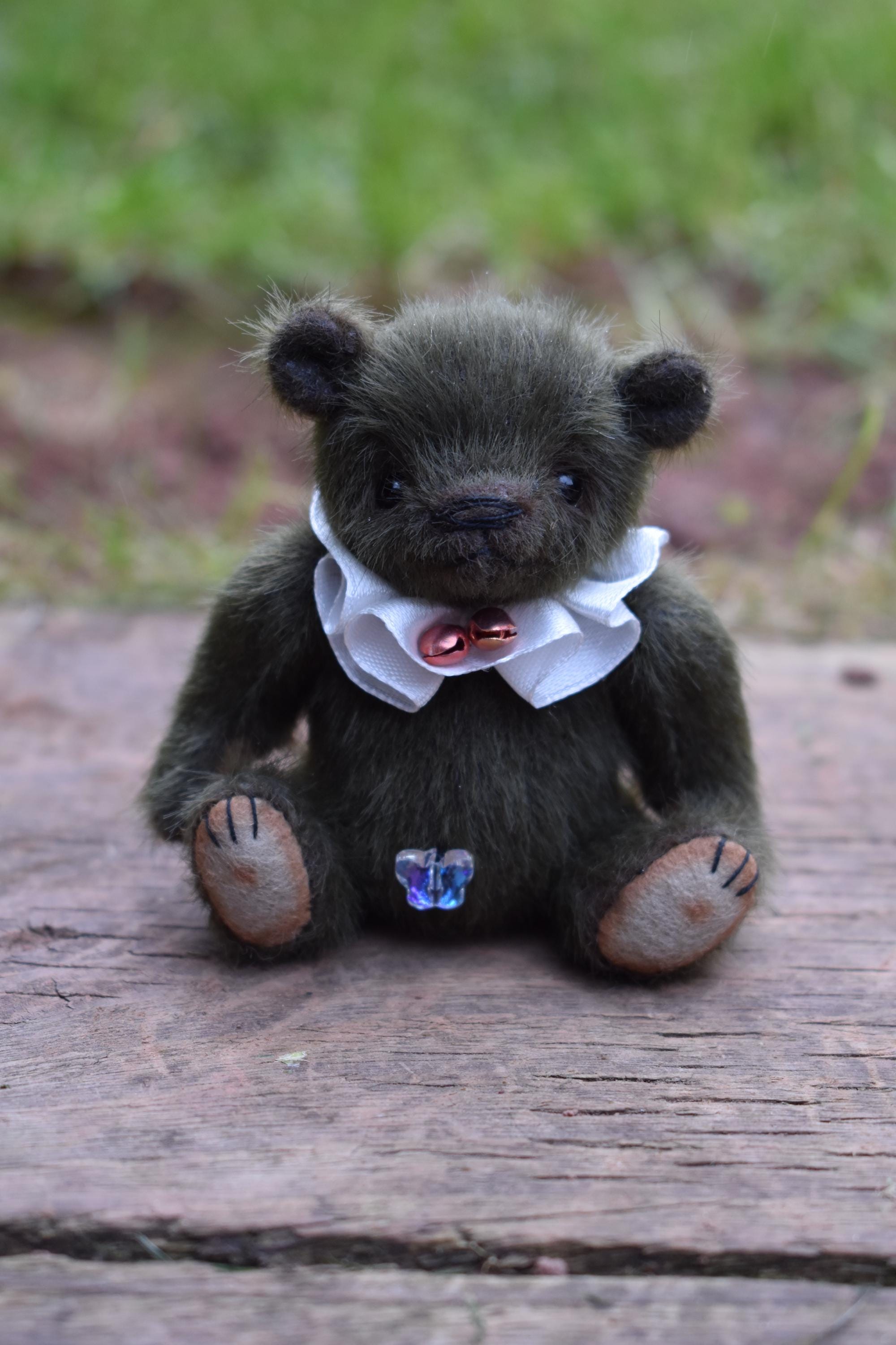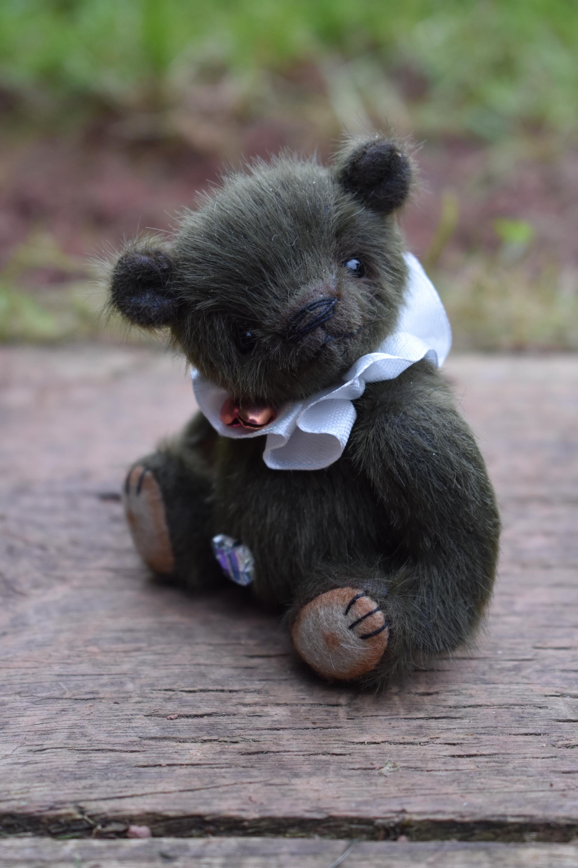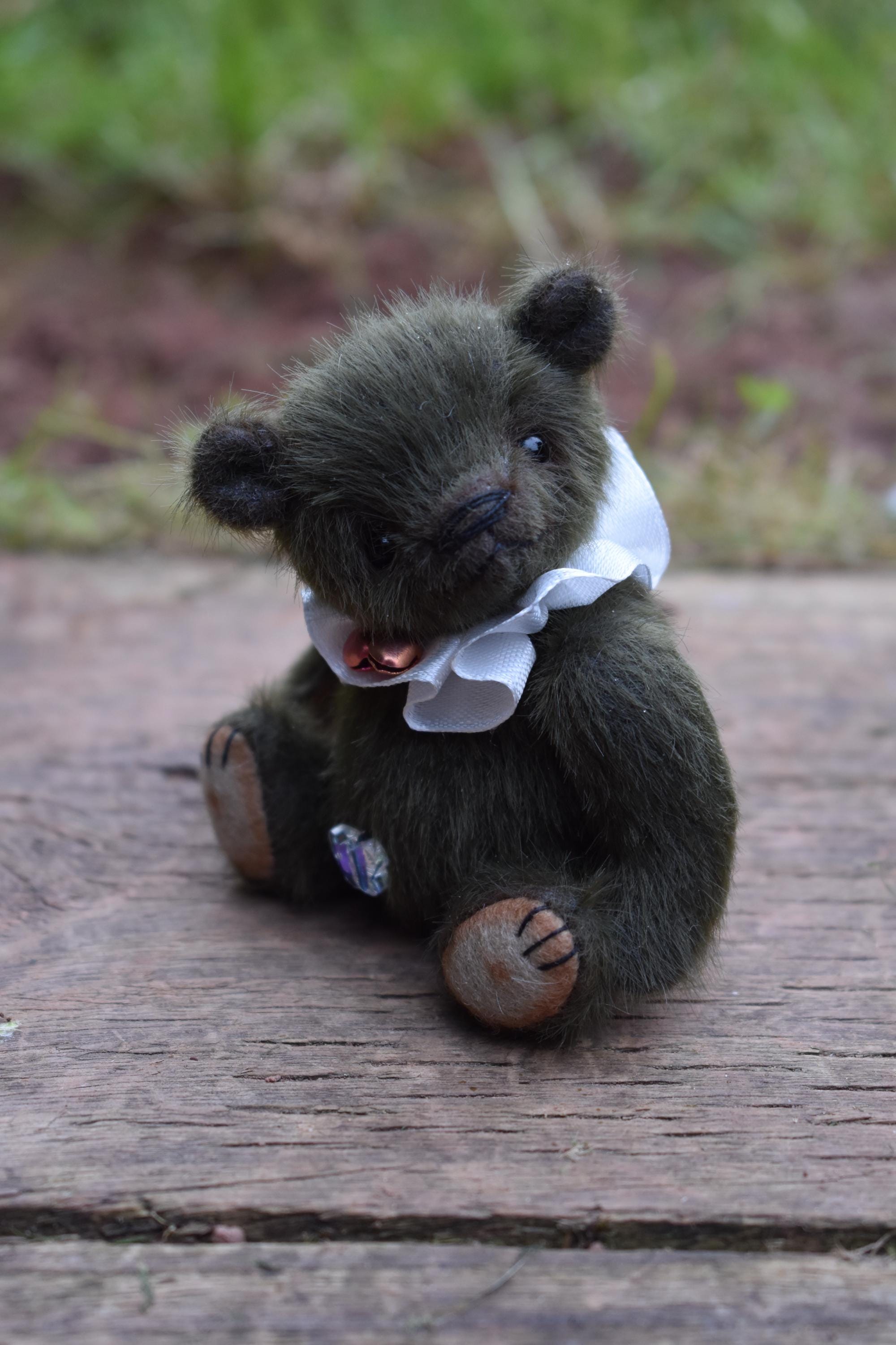 Little Buddy is just 4" tall, and seated is just over 3" high. He is made from a soft and fluffy dark green mini bear fabric, and has tan felt paw pads. He wears a little ruff around his neck made from a white satin ribbon, with two little bells attached.