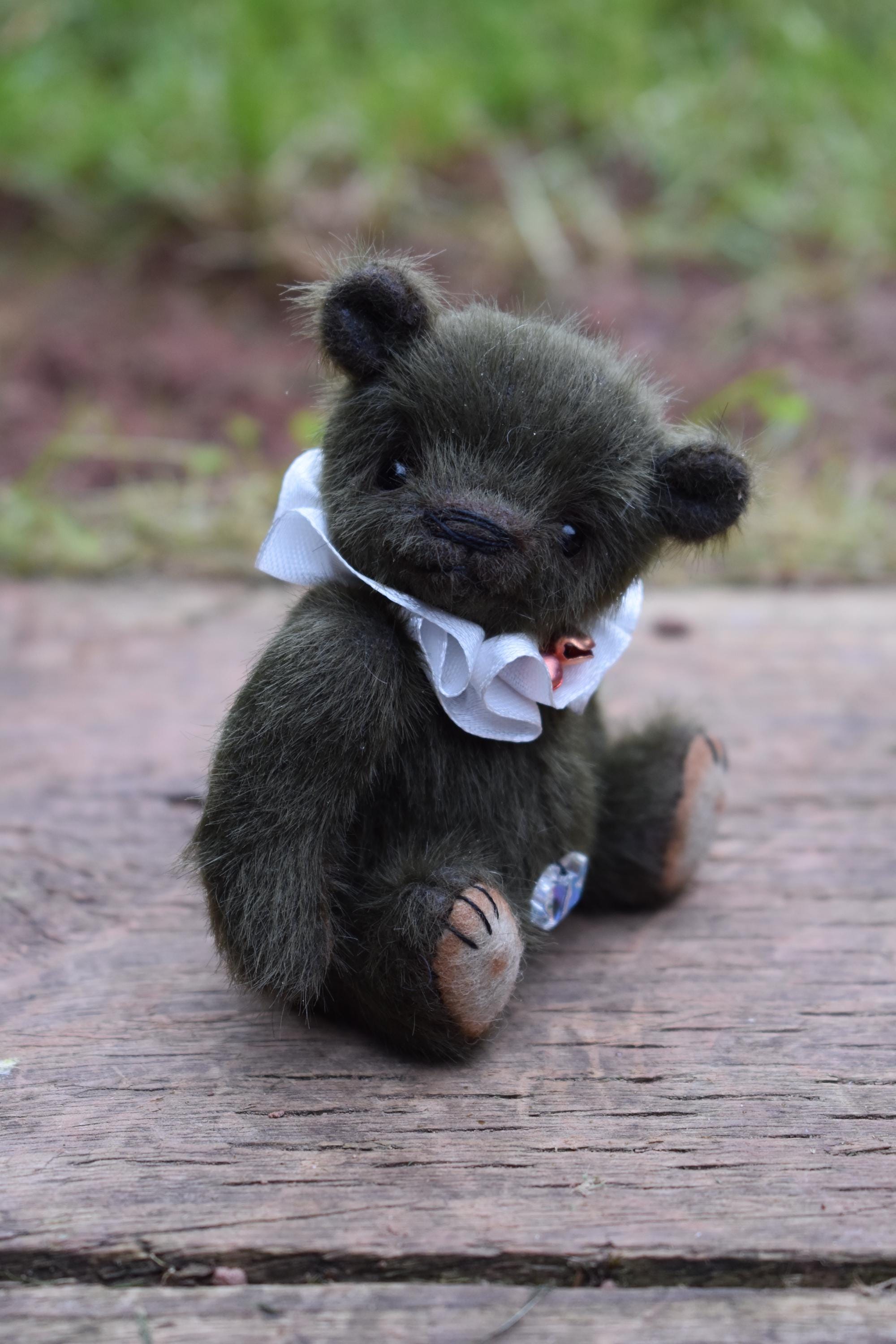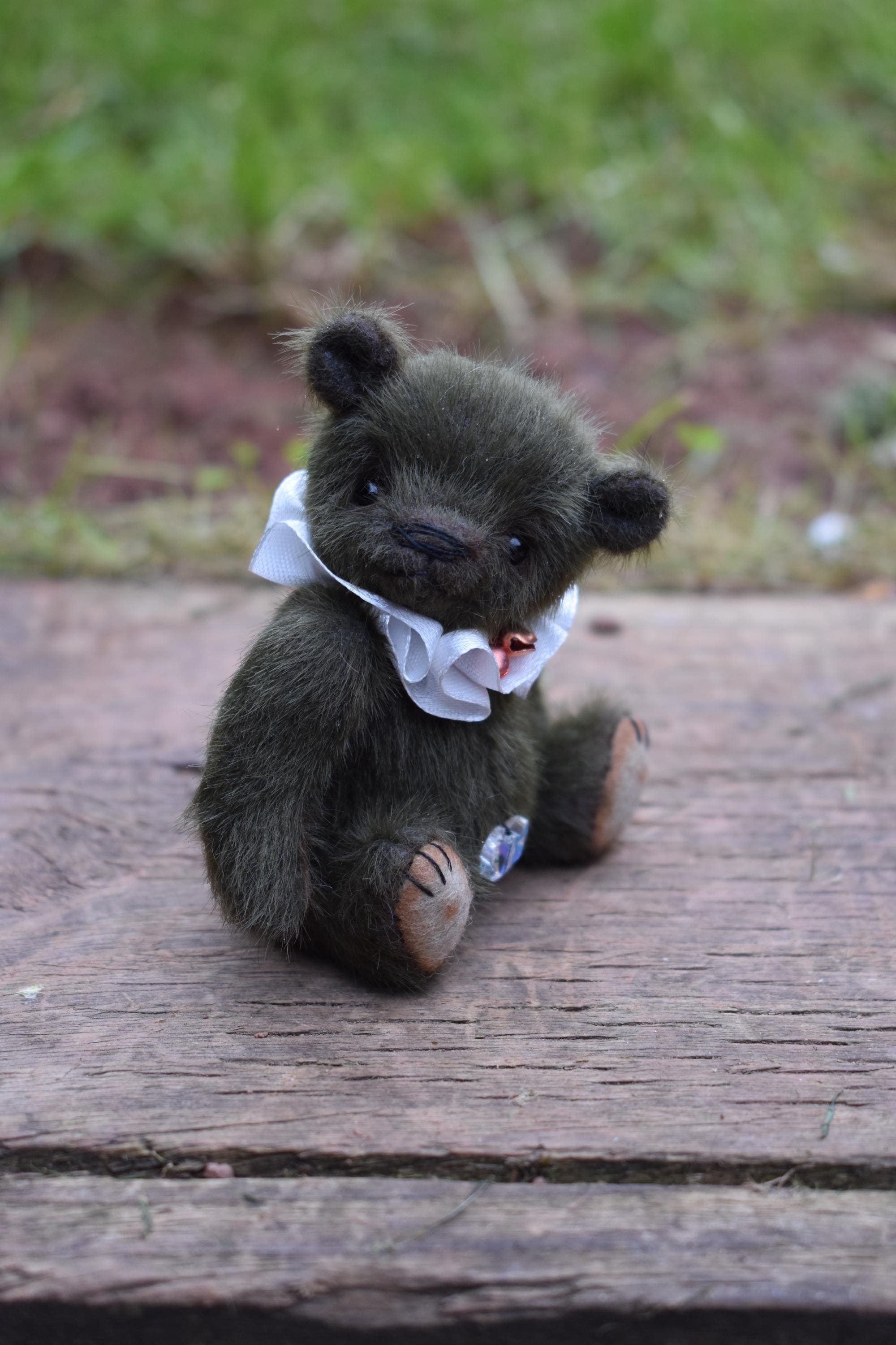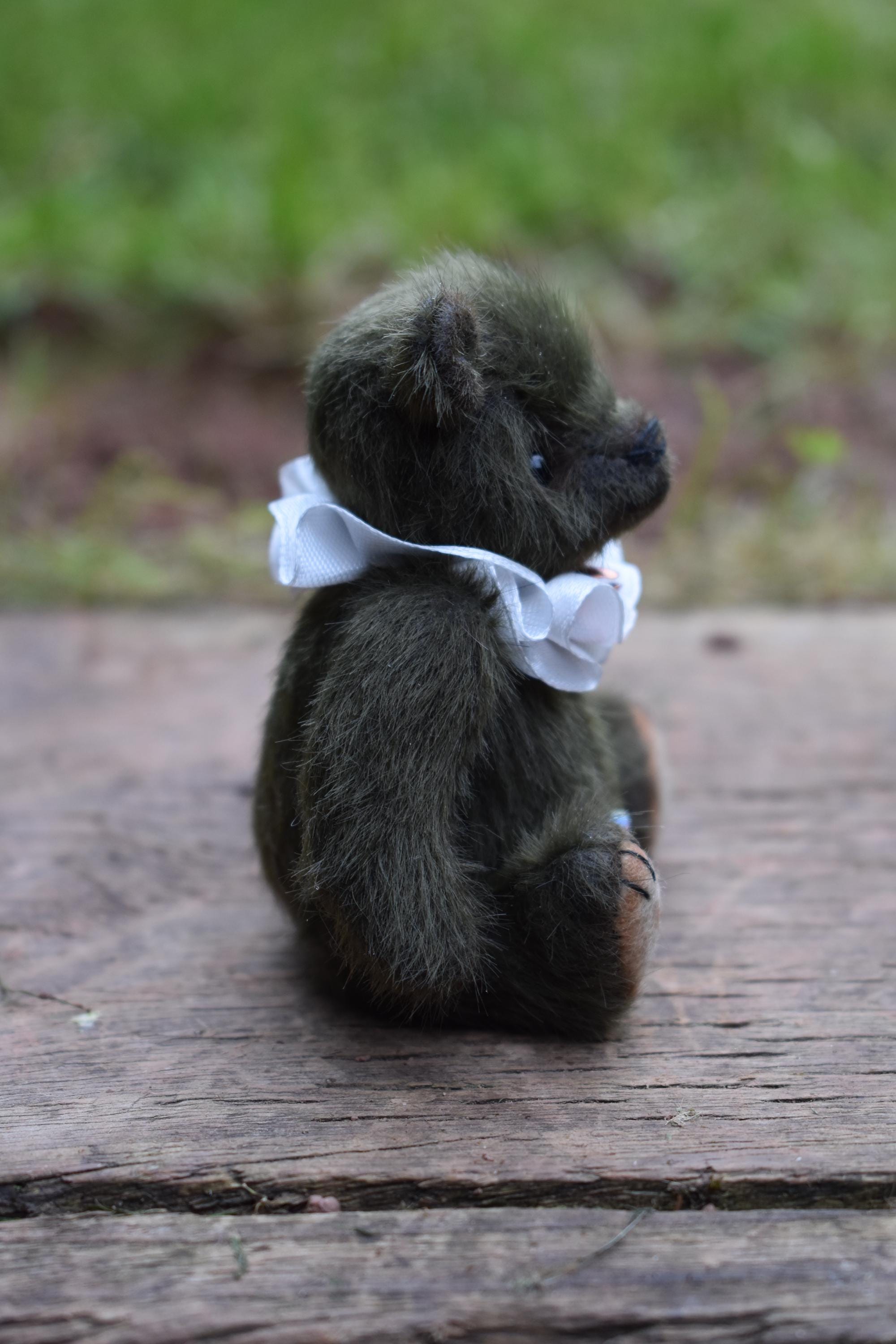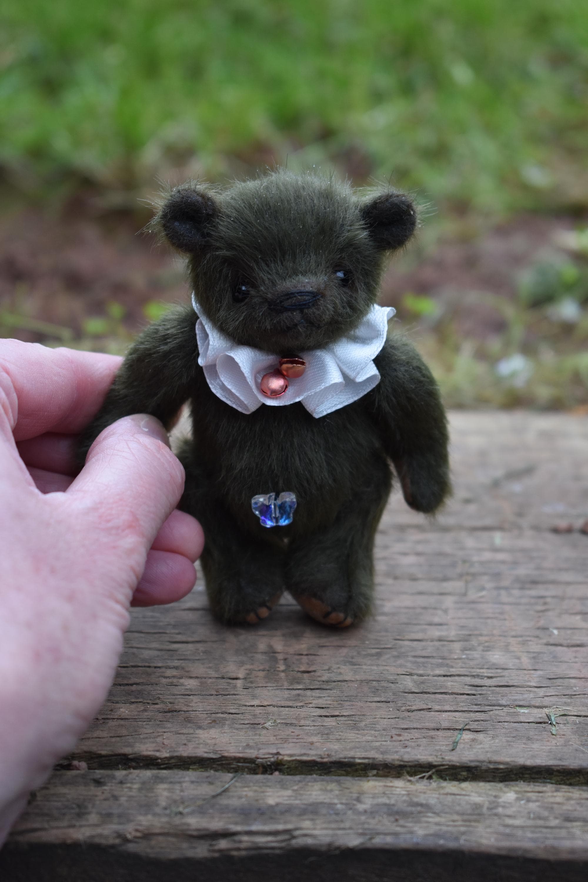 Little Buddy is just 4" tall, and seated is just over 3" high. He is made from a soft and fluffy dark green mini bear fabric, and has tan felt paw pads. He wears a little ruff around his neck made from a white satin ribbon, with two little bells attached.