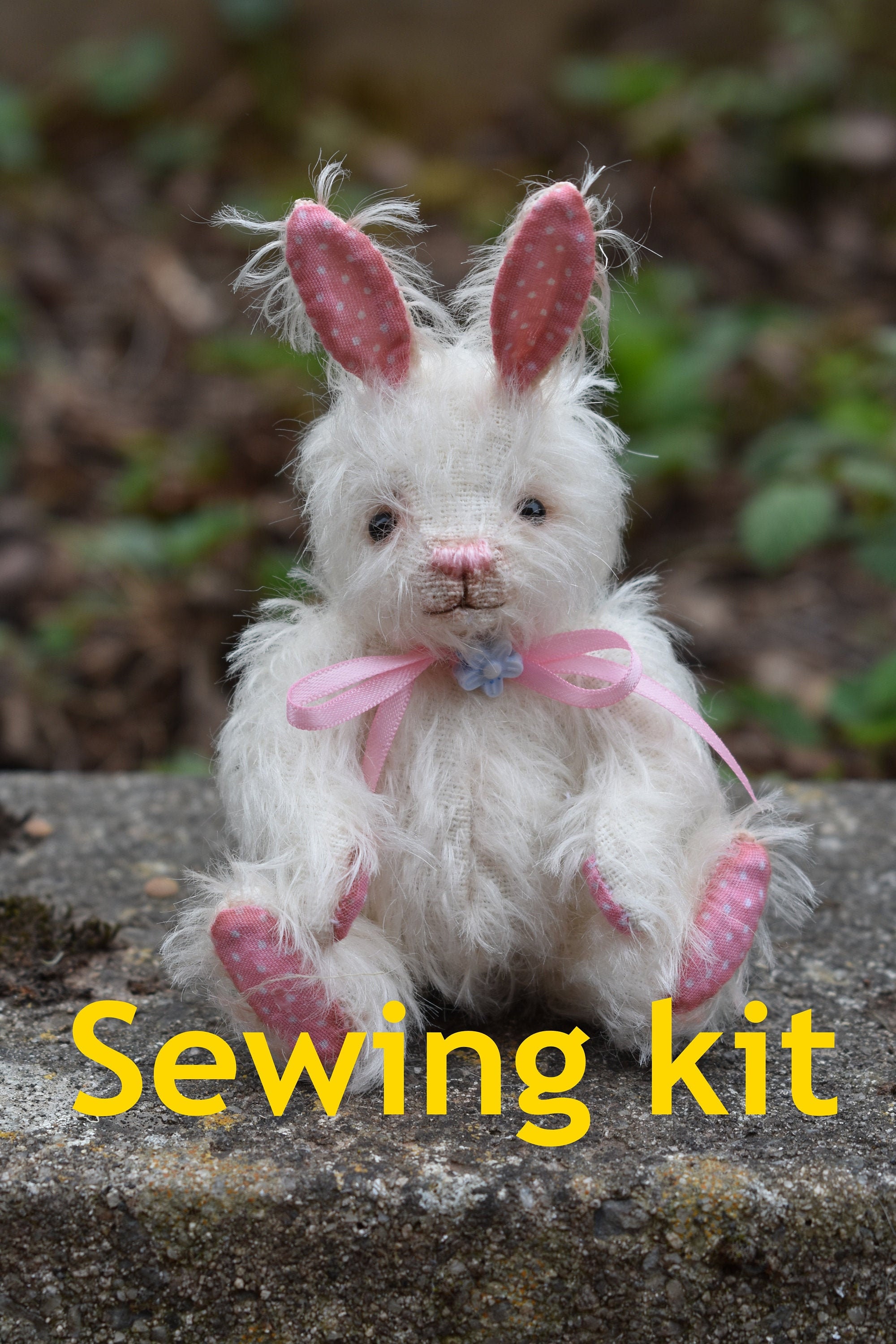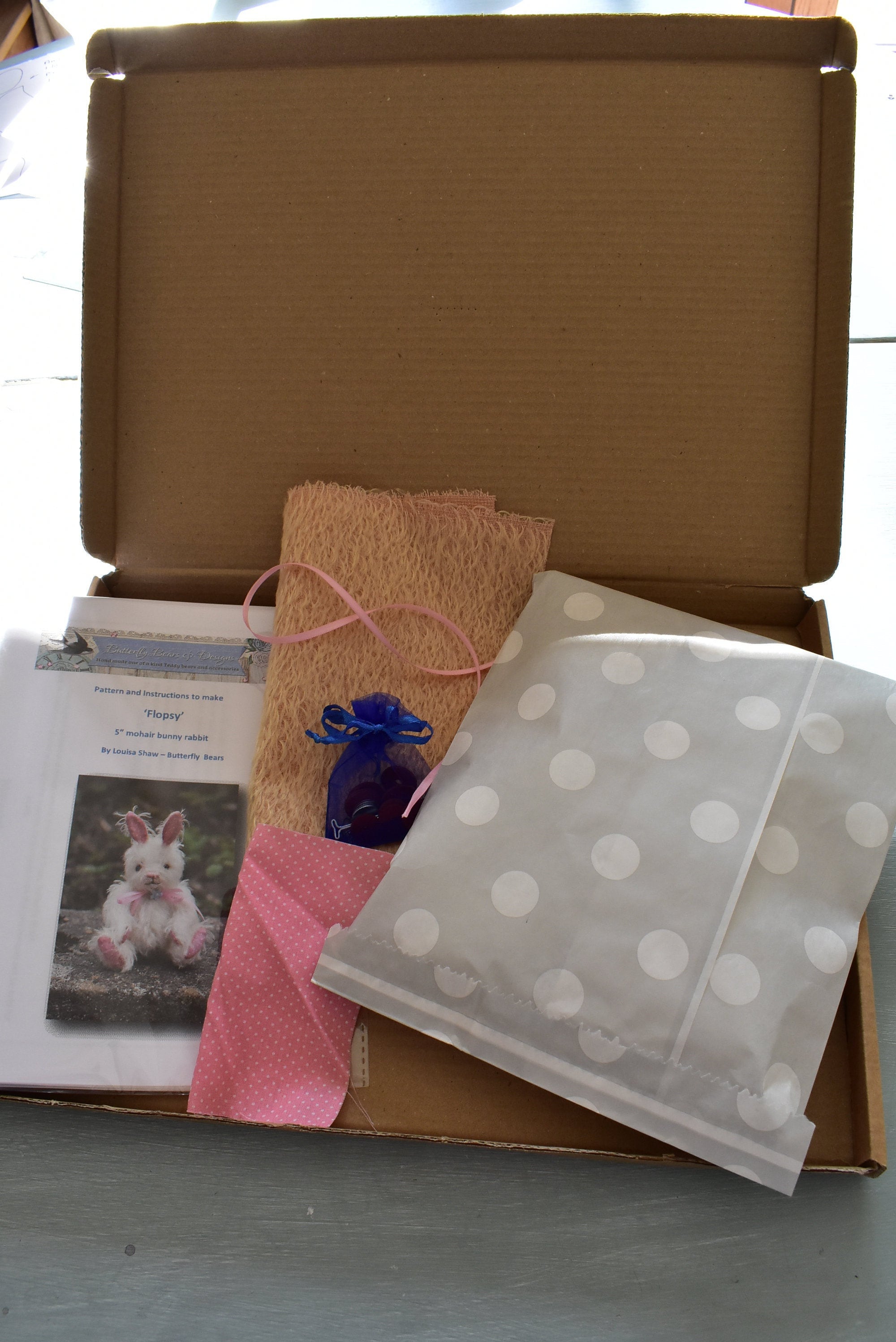 This is a complete sewing kit containing everything (except standard thread, needles and tools) that you need to make a collectors mohair bunny like 'Flopsy' (pictured), who is 5" tall.