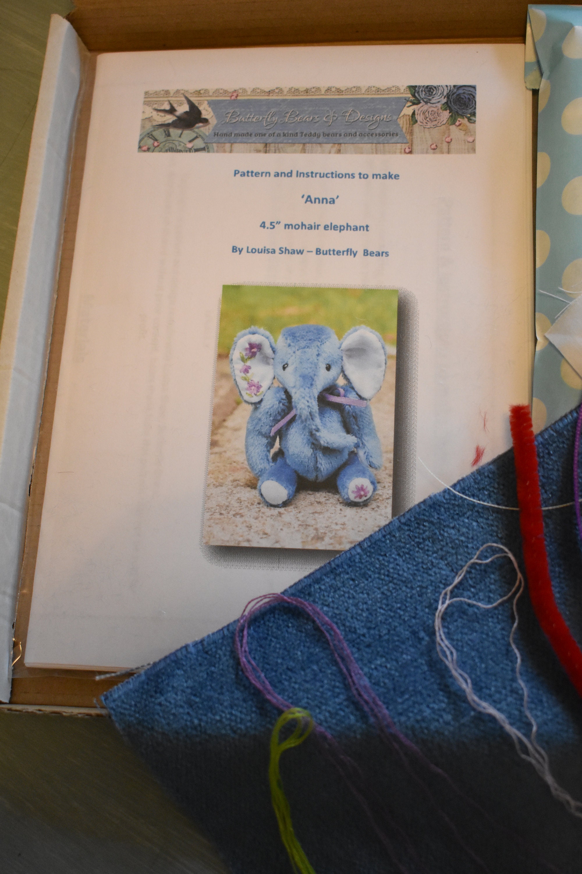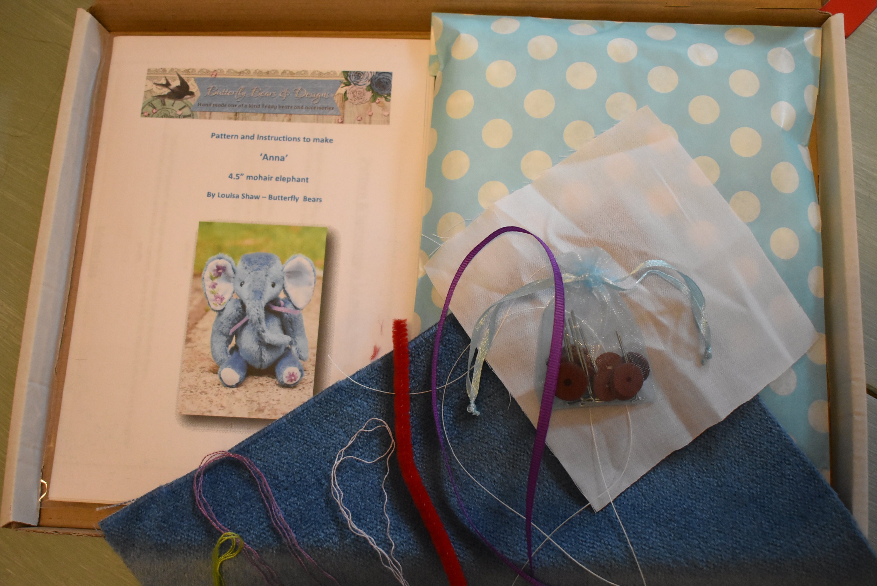 This is a complete sewing kit containing everything (except thread and tools!) that you need to make a collectors mohair elephant like 'Anna' (pictured), who is 4.5" tall.